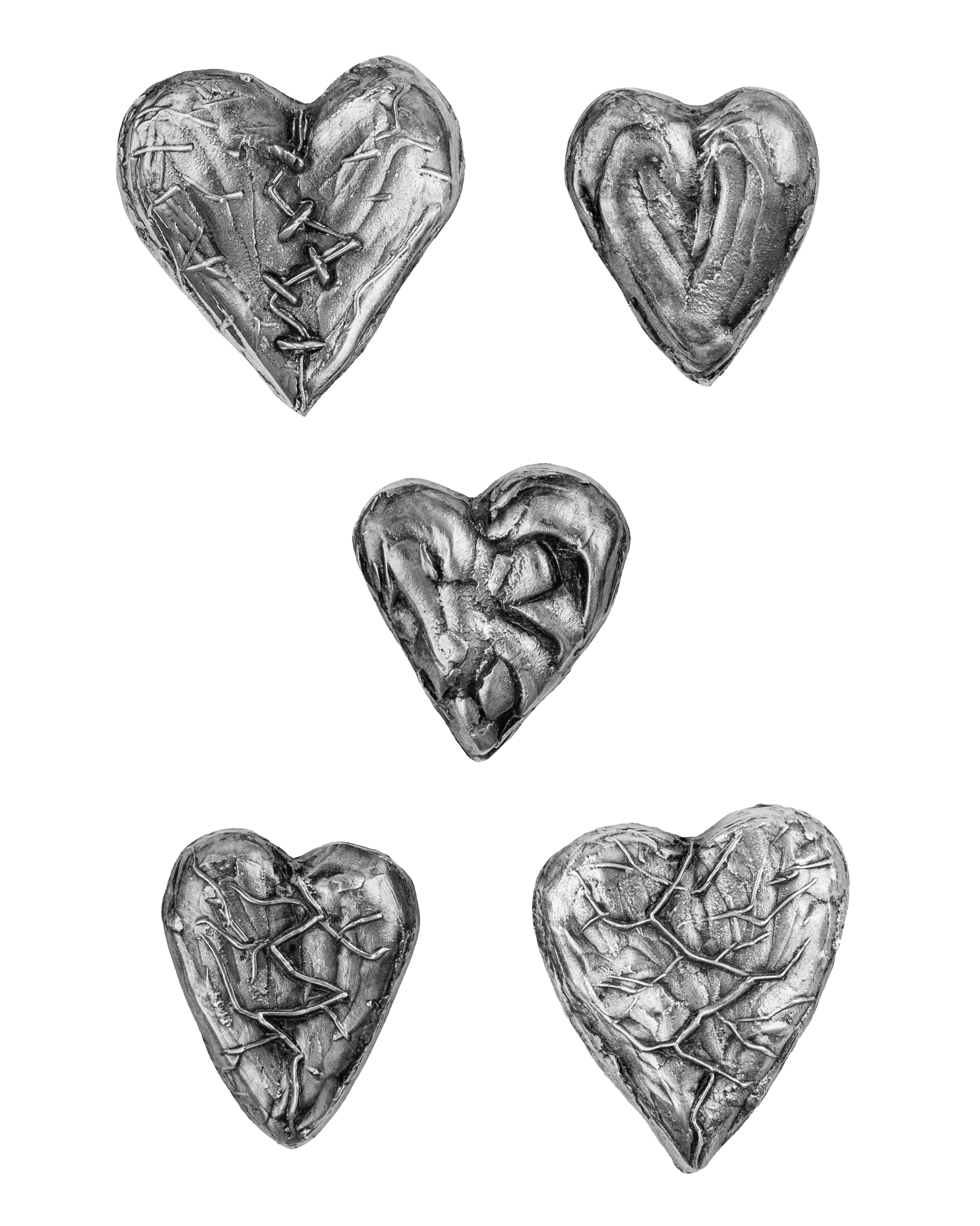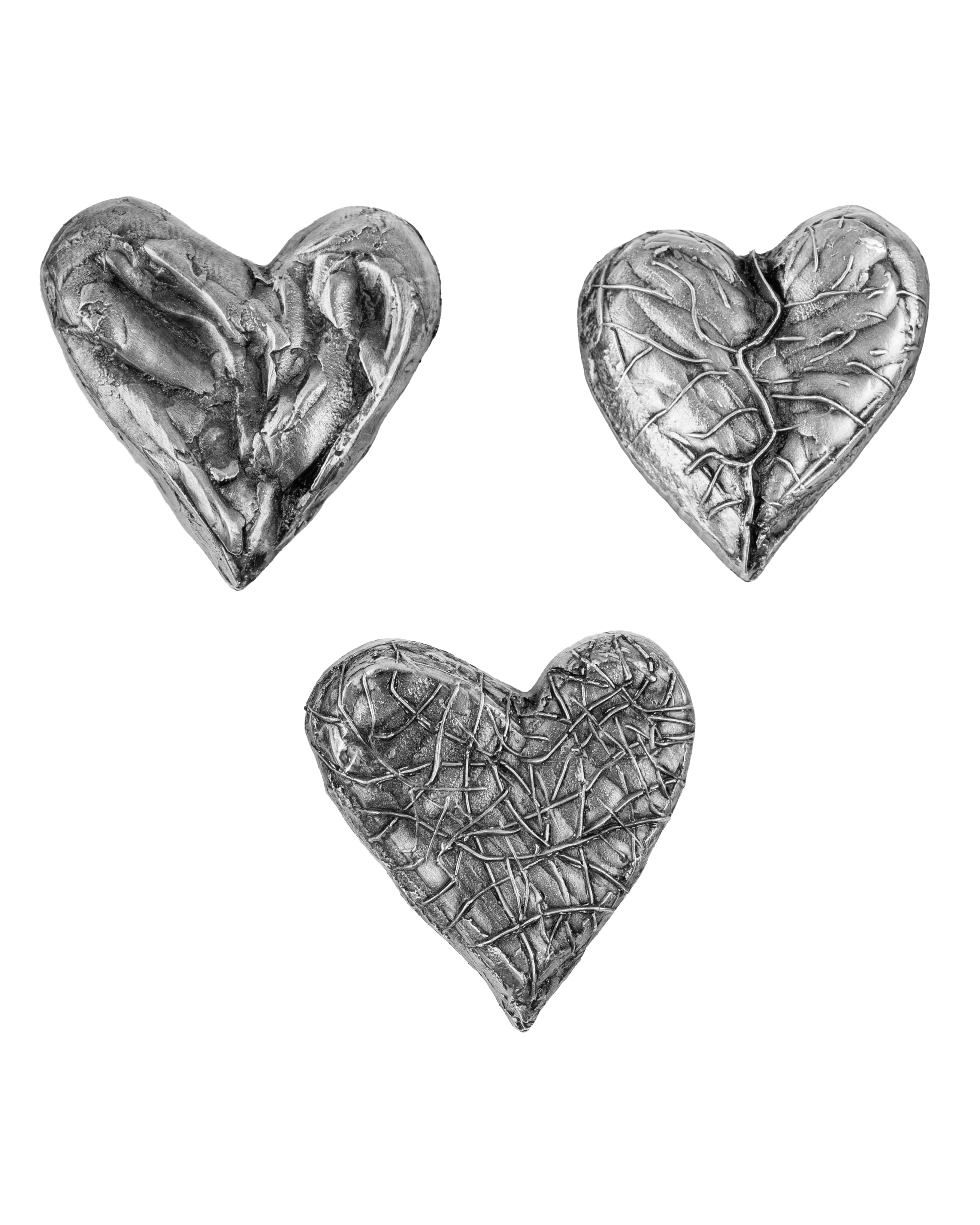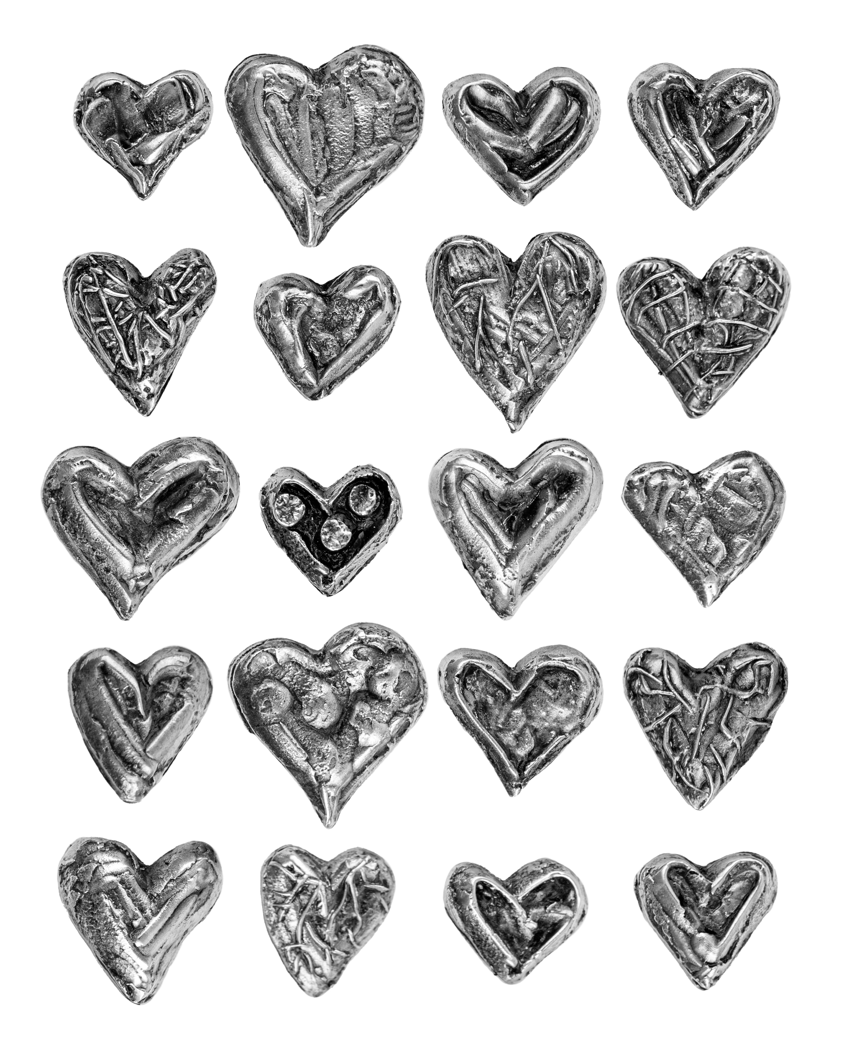 When I returned to my studio, I translated this inspiration into form. I sculpted three series of unique hearts, each with its own texture, shape, and character. From these, I selected 33 pieces that felt the most alive.